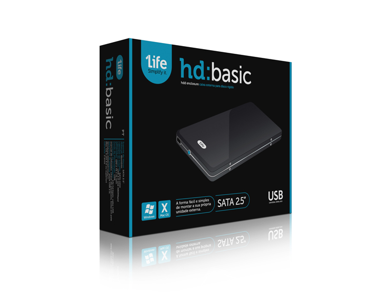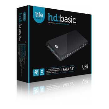 Caixa externa em alumínio, para discos rígidos SATA 2.5", com interface USB 2.0.