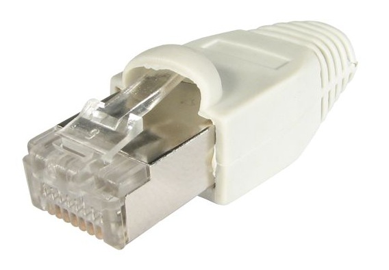 Conjunto de 10 conectores RJ–45 e 10 protectores de conector, para assemblagem de chicotes de cabo de rede. Disponível em Categoría 6E e 5E.