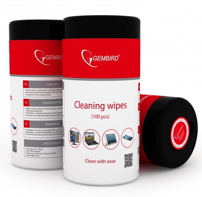 100 toalhetesda Gembird para limpeza de todos os tipos de ecrãs. Uma fórmula anti-estática especial impede a acumulação de pó e acabamento não-abrasivo.
