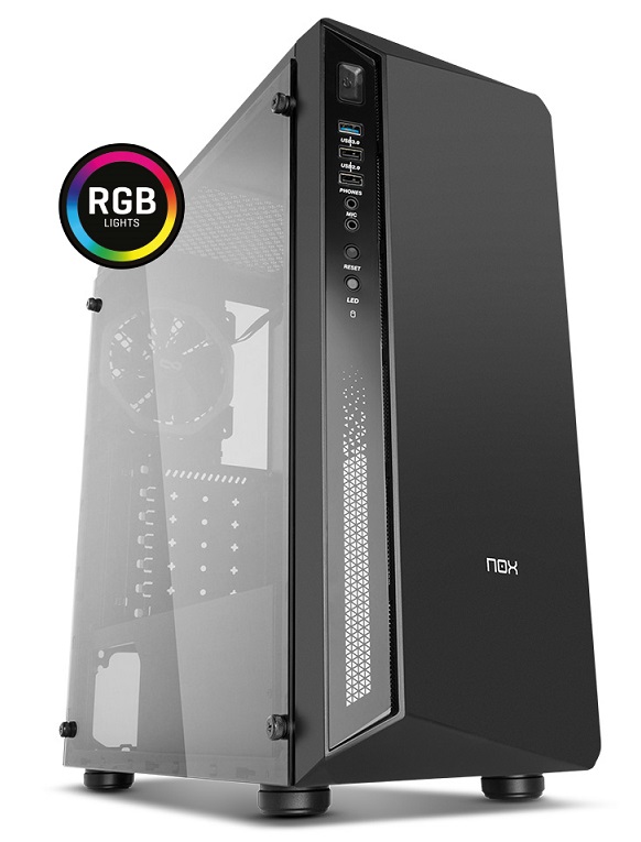 Nox Infinity Atom - Chassis médio compatível com formato ATX, com painel lateral em vidro temperado e iluminação LED RGB. Inclui compartimento isolado para PSU e HDDs / SSDs