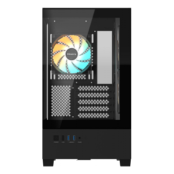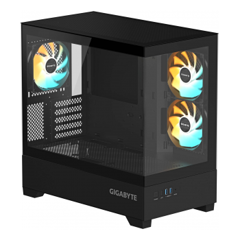 A Gigabyte C201 Panoramic ARGB é uma caixa Micro-ATX moderna, com foco na estética panorâmica e elevada capacidade de arrefecimento. Com painéis frontais e laterais em vidro temperado de 3 mm, proporciona uma vista limpa e deslumbrante dos componentes internos, enquanto o design sem furos reforça a durabilidade e elegância. Inclui três ventoinhas ARGB e suporte para radiadores até 360 mm, com fluxo de ar otimizado por amplas grelhas de ventilação e filtros de pó de fácil manutenção.