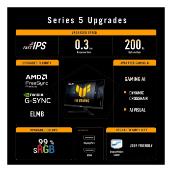 O Asus TUF Gaming VG279Q5A é um monitor de 27 polegadas desenvolvido para gaming competitivo, combinando um painel Fast IPS com resolução Full HD e uma impressionante taxa de atualização de 200 Hz. Com um tempo de resposta ultrarrápido até 0,3 ms e compatibilidade com FreeSync Premium e G-SYNC, garante imagens extremamente fluidas e sem interrupções. Inclui ainda tecnologias avançadas como ELMB Sync, HDR10 e funcionalidades com inteligência artificial, oferecendo uma experiência imersiva, precisa e altamente responsiva.
