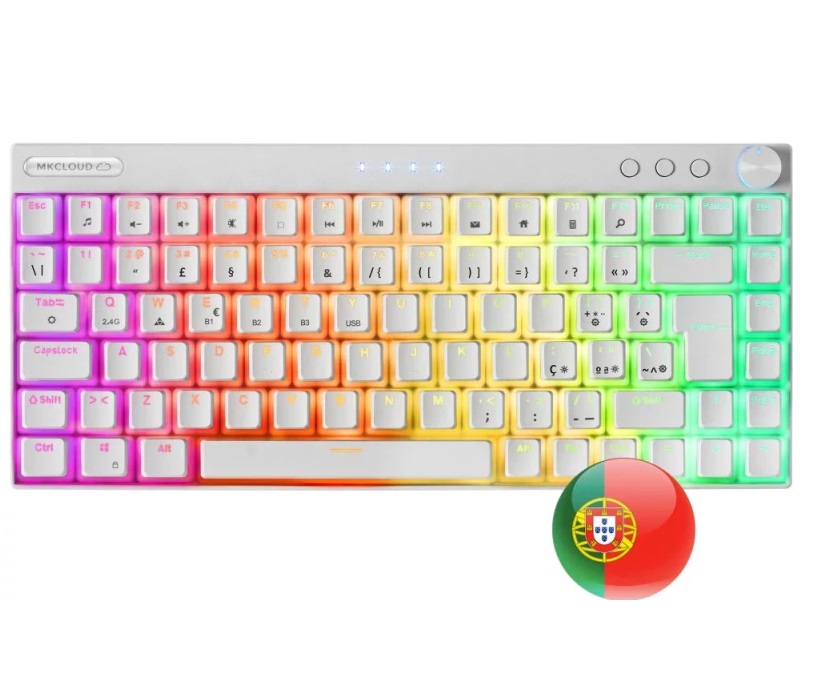 O Mars Gaming MKCloud White é um teclado mecânico premium compacto de 75%, ideal para quem procura portabilidade sem abdicar da performance. Com estrutura branca elegante, iluminação RGB Chroma personalizável e keycaps PBT pudding, oferece uma experiência visual impressionante. A conectividade tripla (USB-C, 2.4GHz e Bluetooth 5.0) garante compatibilidade com múltiplas plataformas. Equipado com switches mecânicos Outemu SQ Blue à prova de pó, proporciona precisão tátil e longa durabilidade, sendo perfeito tanto para jogos como para produtividade.