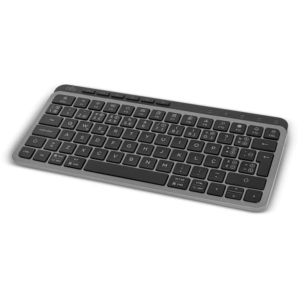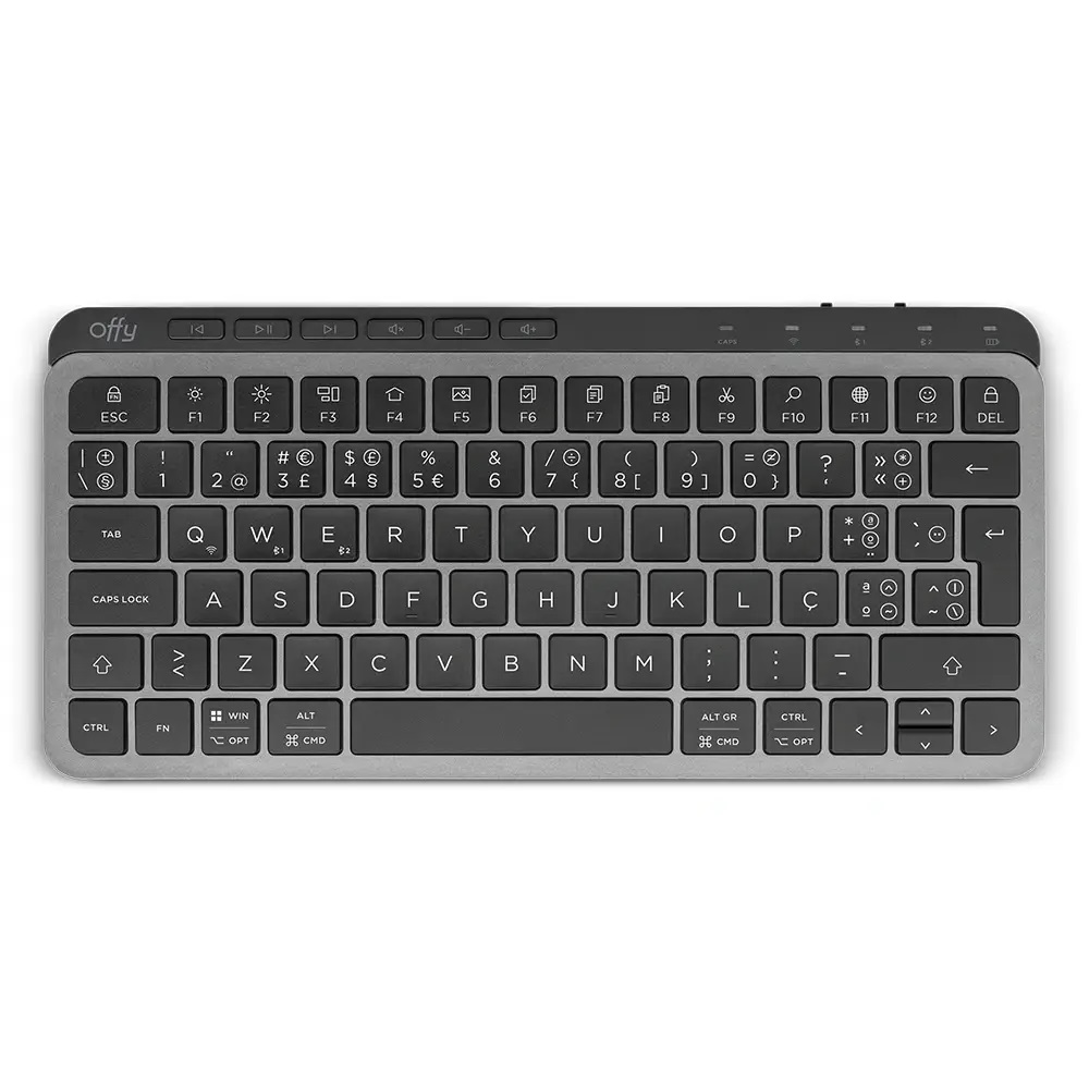 O Teclado Offy Flexi Mini Wireless/Bluetooth PT Cinza foi concebido para quem procura funcionalidade num formato compacto. Com design elegante e estrutura resistente, oferece uma experiência de escrita confortável com teclas silenciosas e de baixo perfil. A sua dimensão reduzida permite uma secretária mais organizada e fácil transporte, ideal para ambientes de trabalho flexíveis. Compatível com múltiplos sistemas operativos, permite ligação via Bluetooth 5.1 ou recetor USB 2.4 GHz, com autonomia de até 130 horas.