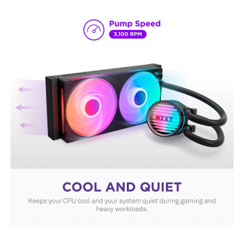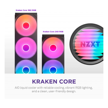 O NZXT Kraken Core 240 RGB é um water cooler all-in-one de alto desempenho, concebido para oferecer refrigeração eficaz com o mínimo de ruído, mesmo sob uso intensivo. Com duas ventoinhas de 120 mm e iluminação RGB endereçável, alia desempenho térmico avançado a um visual moderno e personalizável. A bomba de 3.100 RPM garante eficiência no arrefecimento, enquanto a instalação simplificada e o suporte a sockets recentes o tornam ideal para setups gaming ou profissionais.