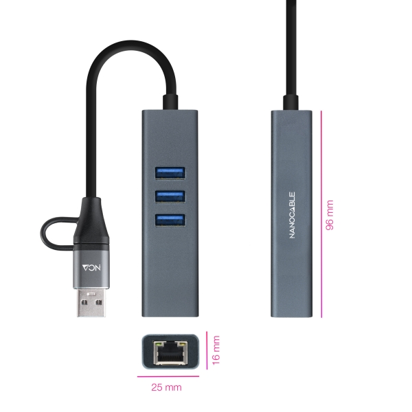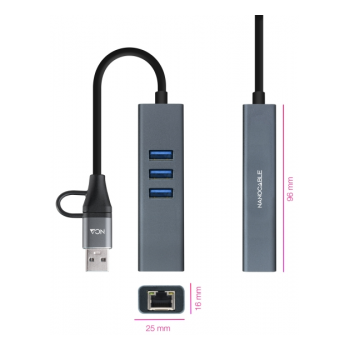 Hub USB-C/A Nanocable Ethernet Gigabit e 3xUSB-A 3.0