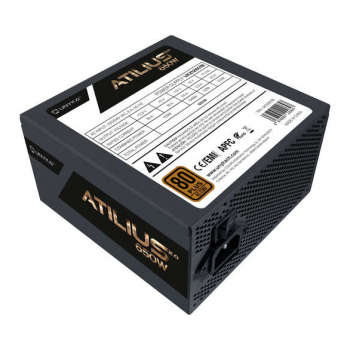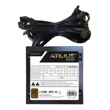 A Unykach Atilius 2.0 Black 650W é uma fonte de alimentação ATX 2.3 com certificação 80 Plus Bronze, indicada para utilizadores que exigem potência real, estabilidade e eficiência energética. Com um ventilador de 120 mm ultra silencioso e sistema de refrigeração ativa, oferece um desempenho fiável com baixos níveis de ruído. A sua eficiência de 85% reduz o consumo energético, tornando-a uma solução económica a longo prazo. O seu design preto sóbrio encaixa facilmente em qualquer configuração, enquanto o sistema APFC garante um fornecimento de energia estável e seguro.