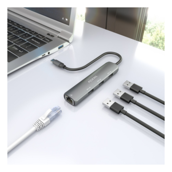 O adaptador Aisens ASUC-4P038-GR é uma solução versátil que combina um conversor de USB-C para Ethernet Gigabit com um hub USB 3.0 de três portas. Ideal para expandir a conetividade de dispositivos modernos com porta USB-C, oferece alta velocidade de transferência de dados, suportando até 1000 Mbps na rede e 5 Gbps via USB. Compatível com vários sistemas operativos, é uma ferramenta prática, compacta (15 cm) e de utilização imediata (plug & play) na maioria dos sistemas.
