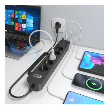 A extensão elétrica com 5 tomadas Schuko e portas USB integradas é uma solução prática e versátil para alimentar e carregar múltiplos dispositivos em simultâneo. Com um design moderno em branco e construção segura com materiais ignífugos, oferece uma combinação ideal entre funcionalidade, proteção e eficiência. Integra portas USB-C e USB-A com tecnologias de carregamento rápido, permitindo carregar smartphones, tablets e outros equipamentos de forma rápida e segura, enquanto mantém o espaço organizado e funcional.